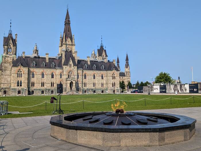 West Block with the Centennial Flame in the foreground