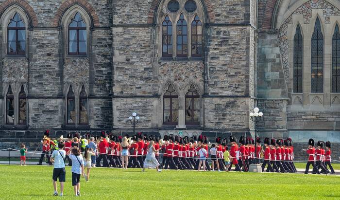 The next day, we drove back into Ottawa for a tour of the House of Commons. (We had also previously booked a tour of the Senate as well, but it had been cancelled due to "parliamentary activity".) Both branches of government are normally housed in the Center Block of Parliament, but that building is undergoing a multi-year, multi-billion-dollar renovation project which isn't expected to be completed until at least 2030. So, the House of Commons has a temporary home set up in the West Block building in a converted courtyard, and that's what we got to see. We arrived a little early to witness the "Changing of the Guard" ceremony and listen to the band concert.