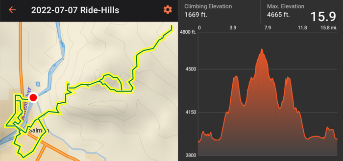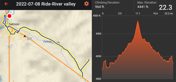 Another day, we rode through the countryside on a pleasant road that followed the Lemhi river out from town (22.25 miles).