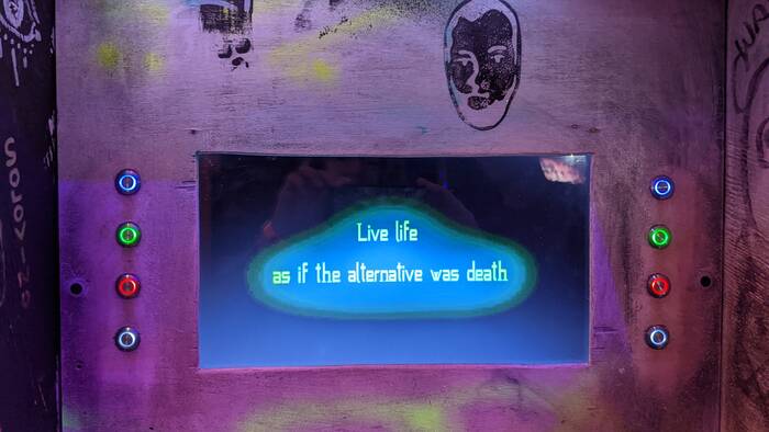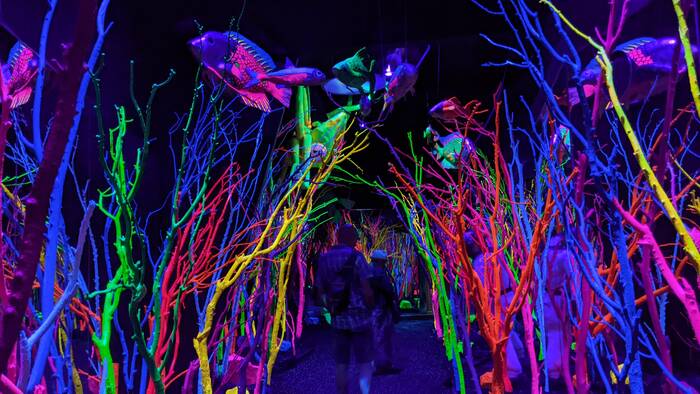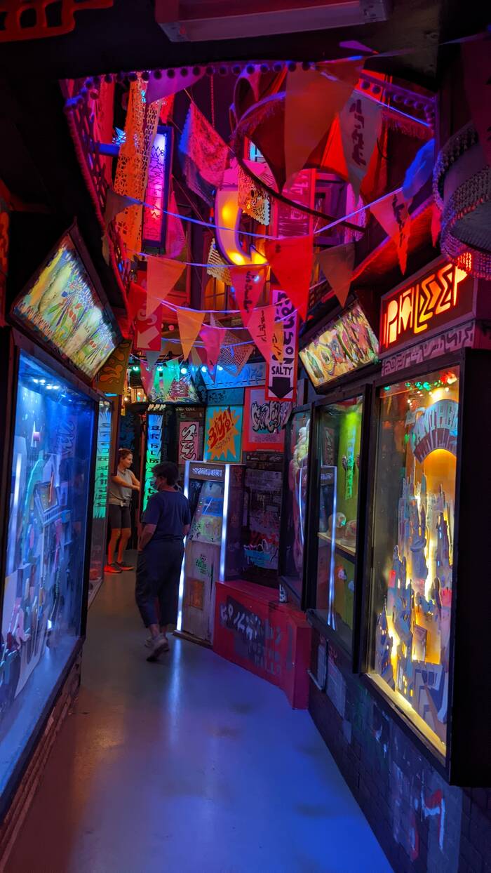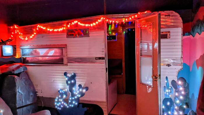 For our first day in Santa Fe, we had purchased tickets for Meow Wolf. You might be wondering what that is. Well, it is a bit hard to describe. Their website puts it this way: "Meow Wolf's House of Eternal Return is a mind-bending, explorable art experience for people of all ages in Santa Fe, NM". That turned out to be a pretty accurate description, and we ended up enjoying the experience. The facility was quite large, having over 70 "rooms" on two levels. We spent over two hours finding all the secret rooms, interacting with the art, solving the occasional puzzle, and just marveling at the creative use of space. It's hard to really get the feel for the place with pictures, but we'll supply some anyway...