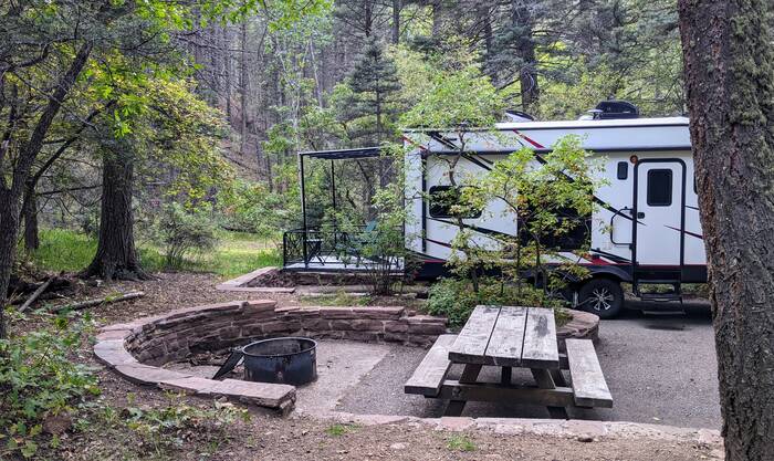 Our trip to Santa Fe was relatively short and uneventful, until we reached the edge of Santa Fe where the roads started to get busy, narrow, and more winding--posing a navigation challenge with a 30 foot trailer! But, all went well with no calamities, and we arrived at our wooded mountain campsite just outside of Santa Fe in time for lunch. When we arrived, the weather was sunny and warm, but soon after lunch some rain came in, and the temperature plummeted to the upper 50s. This was to be the general weather pattern for us for the next several days here up in the mountains (with the exception of the warm part--we didn't see warm up here again). Fortunately, our campsite was just a 20 minute trip down to town where it was sunny and warm (70s) most of the time. We ended up heading to town every day.