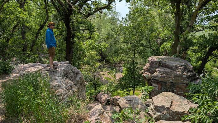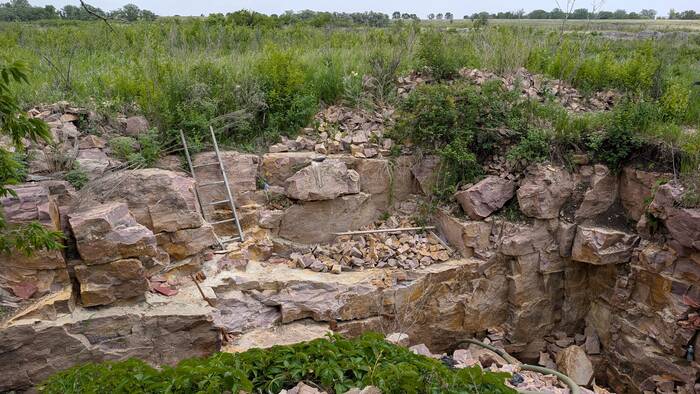 The next day's activity was Pipestone National Monument in southwestern Minnesota, about a 45 minute drive from Sioux Falls. The monument preserves an interesting geological area containing a historic catlinite (aka pipestone) quarry that Native Americans used for raw material for their ceremonial pipes. As national monuments go, it is pretty small--a visitor center and a 3/4 mile trail rounds out the public access portion of the park. Additional acreage is set aside for registered present-day tribe members to mine pipestone via permit. Only hand tools are permitted, and it is difficult and tedious work to dig through the deep layer of hard quartzite before reaching the relatively thin layer of pipestone.