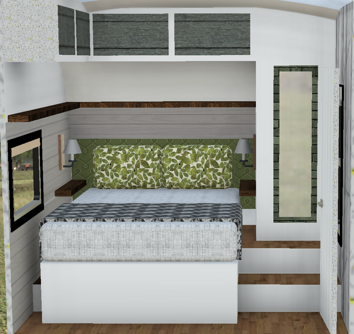 Another fake view . . . this one is with the wall of the camper missing and looking back towards the hallway and bathroom. The hall is the door next to with window and the other sliding door leads to the bathroom.