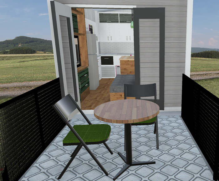 New to the view is the french doors and wall which will be built just in front of the ramp! This will allow us to open the ramp and use it as a deck while still being able to fully seal our camper by closing the french doors.