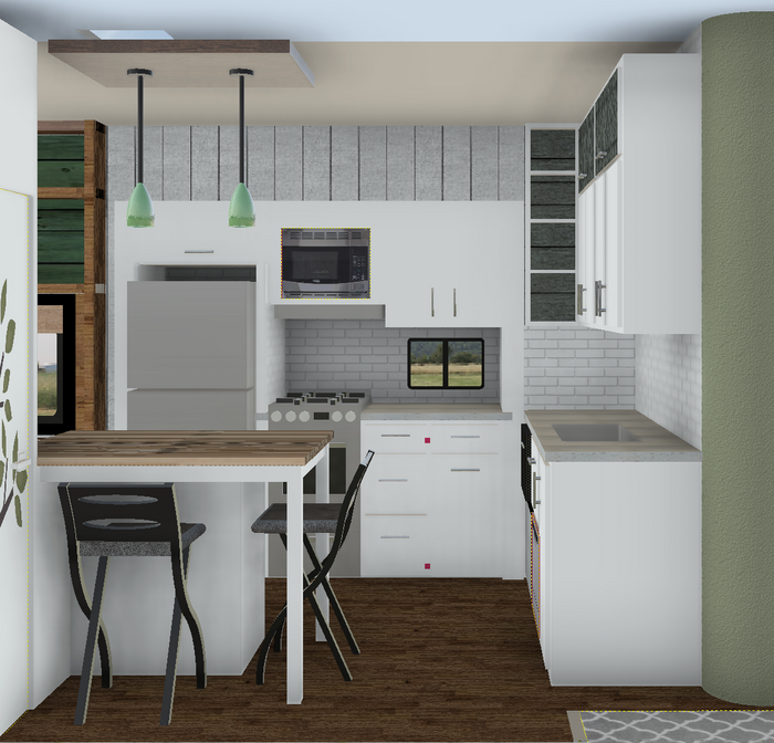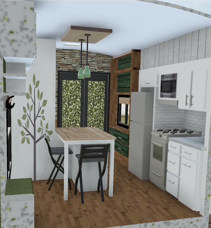 On the back wall is the refrigerator and stove in the slide (same place as original stove and fridge). We are switching to a residential refrigerator and an apartment size stove (so we get real burners and an adult oven). Another addition is a window over the counter so we get extra light - adding a window will be interesting . . .