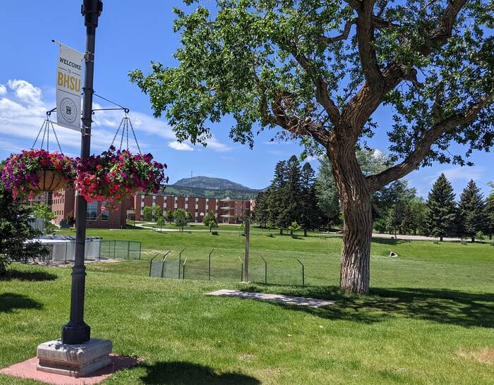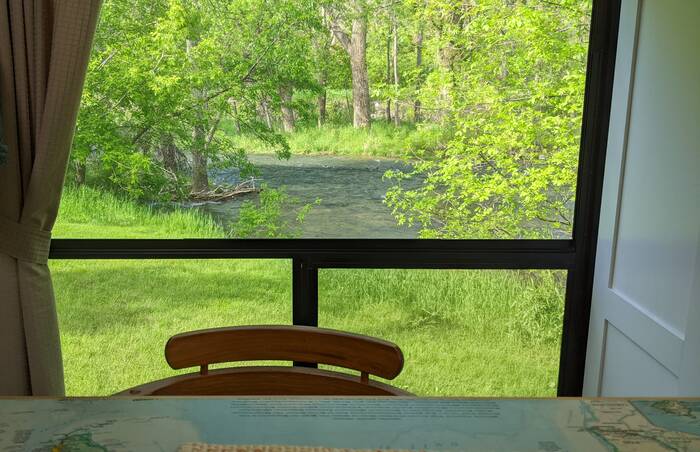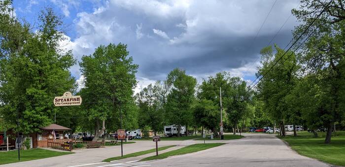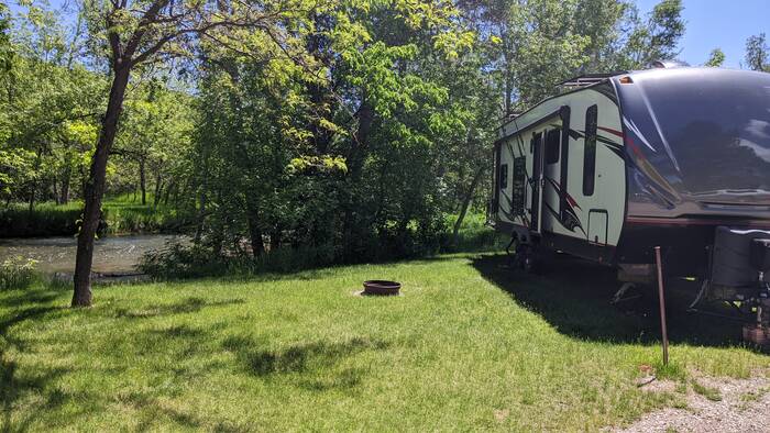 Our arrival at Spearfish City Campground was uneventful except for deciding where to park. We had reserved a less expensive dry camping site (no hookups), but there were no assigned sites. Basically, you could park on any lawn that wasn't a designated numbered site. After a couple of loops around the campground, we found a spot along the river that we could squeeze into without too much trouble. Rick wasn't too keen on parking on the soft-ish grass, and the camper wheels kind of sank in a bit, but it seemed ok. (We'll see how it goes pulling out next week!) It was a nice bonus to have Spearfish Creek in our backyard, though!