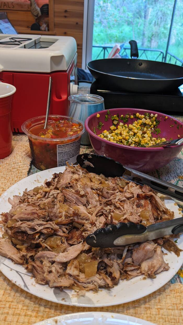 We came home to pork carnitas which had cooked all day in the crock pot while we were gone. Pretty tasty!