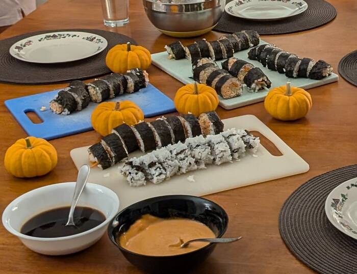 Our previous deck rug was quickly disintegrating, so we had a new one delivered to the kids' house. Julie is not quite sure she loves the bright new look.