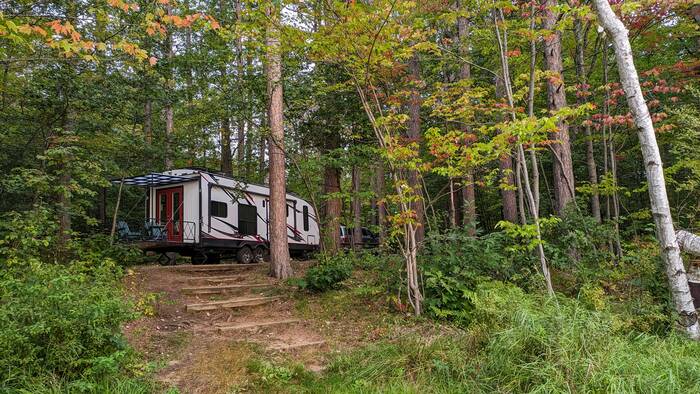 Julie was slightly nervous about our campsite on Starrett Lake. She was sure it would be beautiful, but there was not a lot of detailed info about the particular site she booked, aside from the fact that it would fit a 45' trailer (ours is just over 30'). She has learned over time that just because a site is physically long enough to fit a certain length of trailer, it does not necessarily follow that said trailer can be successfully backed into that site. As we pulled up to the site along the narrow campground road, it was immediately obvious that we were in for a challenge. The combination of the narrow road and the strategic placement of certain immovable trees, as well as a somewhat obnoxiously placed (and very substantial) site post made for a harrowing experience. We grazed one tree (more than once), drove the truck into the forest (sorry little plants), and nearly lost the side mirror to the obnoxious substantial site post. After jockeying back and forth a few times, we finally situated ourselves into our gorgeous lakefront site. The site was indeed large, but a 45' trailer would not have been possible for our skill level.