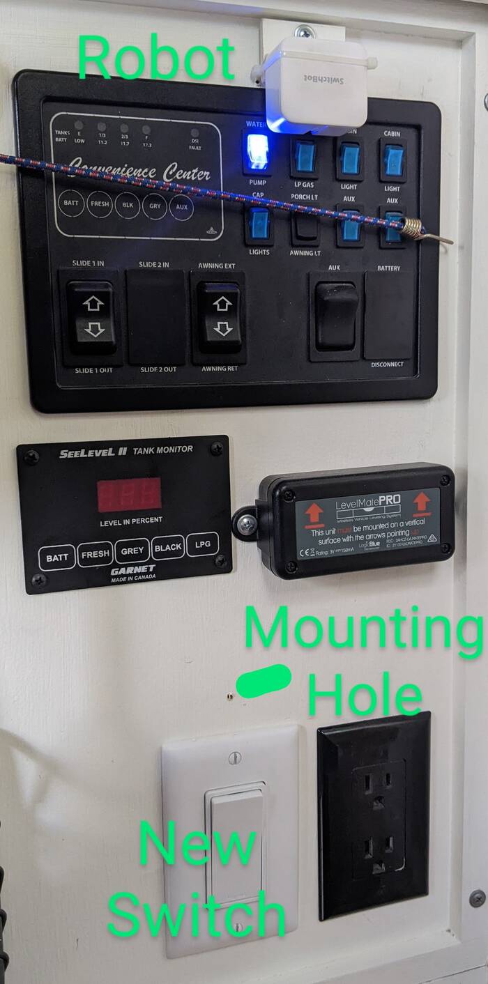 To make the robot work on electric, Rick had to install a new wall paddle switch that turns on the electric water heater (we used to just turn the water heater breaker switch on and off), as well as make the mounting system for the robot moveable so it can be either up top (as it is now) or above the new switch.