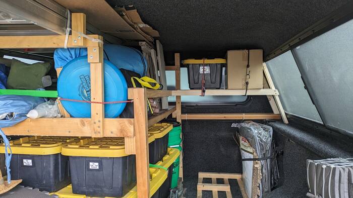 Another upgrade we have photos for is adding a new shelf to the truck. I keep collecting more bits and pieces that need to go somewhere (including a new fairly large sewer hose support), so adding a shelf seemed like the best option.