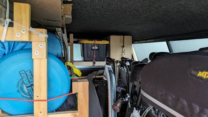New shelf at the back above where the bikes go in. The bin was moved from the big shelf to the left of where it is now. The new box on the right is the sewer hose support we bought for this years winter stay.
