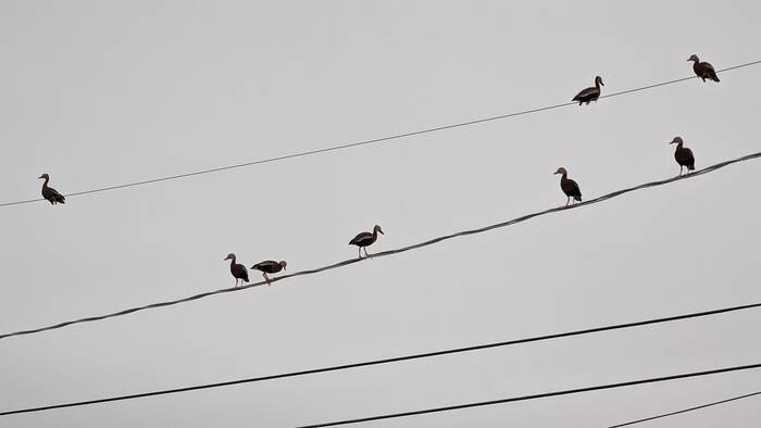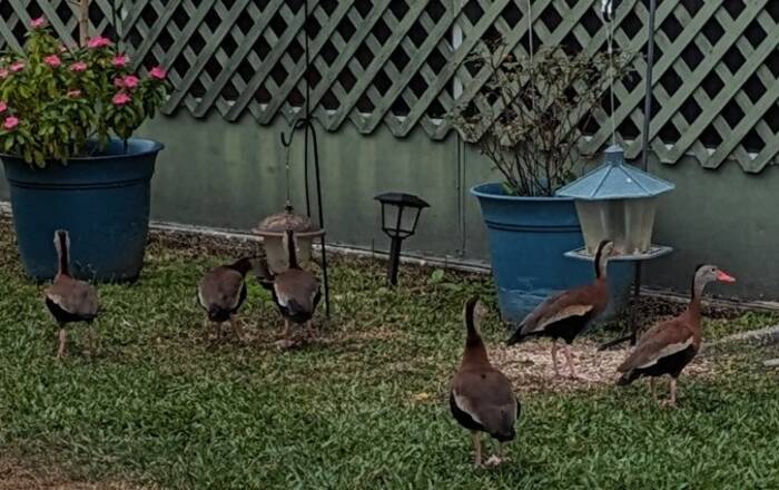 These black-bellied whistling ducks visit us almost every evening We just call them "duck-birds" because they look like ducks but act like birds