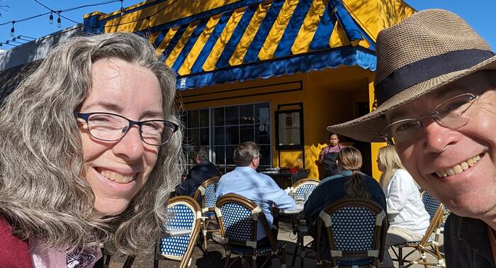Anniversary brunch at a cute outdoor French cafe in Sarasota (We're a little squinty from the sun shining in our eyes)