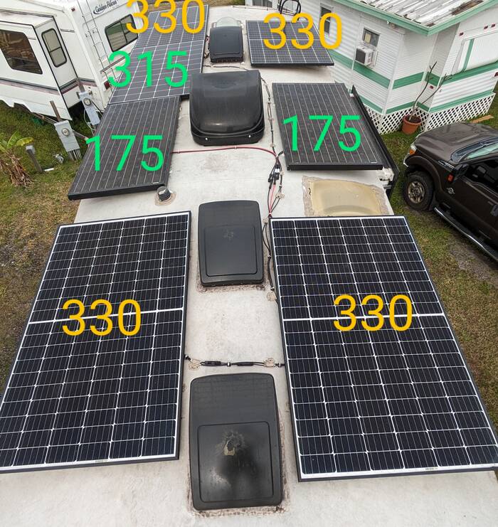 We had some solar-challenged sites last year when parked in deep shade last year, so this was a good time to add as much solar as I could fit on the roof. I found a place in Ft. Myers that sells used solar panels, so I was able to get 3 panels that electrically match my existing ones. For $190 I got one 315-watt panel to put with the existing back set, and two 175-watt panels to put next to the air conditioner with the front set (only $0.285 a watt!). So, this adds around 665 watts which should increase our solar from 1320 watts up to 1953 watts (those numbers don't add up exactly because of finicky stuff that happens when matching panels of slightly different voltages). Because I am just adding this to our existing controllers, they will top out at their maximum output. So, the most we can ever see in full sun is around 1400 watts (100 amps of battery charging), but this "over paneling" should give us a considerable gain under cloudy or tree covered conditions, and that is what we are most interested in.