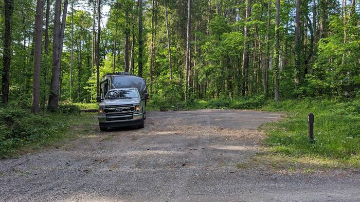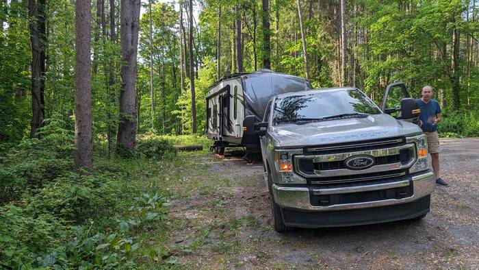 The campgroud roads were a bit tight, but doable. Our campsite was plenty large and easy to get into, but it was very sloped. We tried a few positions until we settled on the back corner of the lot, pretty much in the weeds. That was the only place where we had a chance of getting level by using all of our leveling blocks (which we did end up needing).