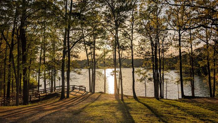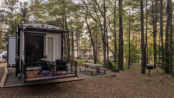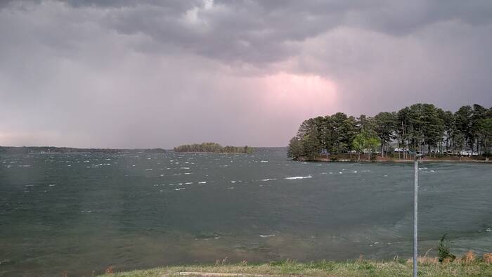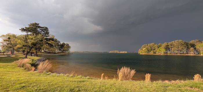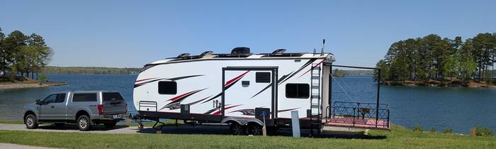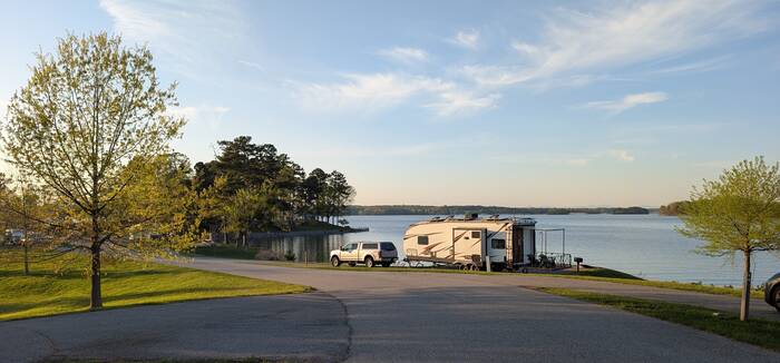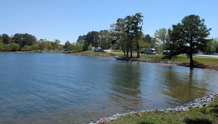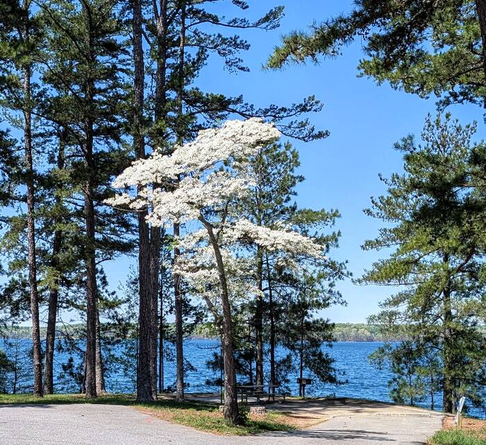 We drove through pretty countryside that would have been photogenic but for the copious amount of rain. Fortunately, the rain stopped before we got to our campground on Lake Sidney Lanier, and we were very grateful for that.