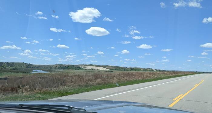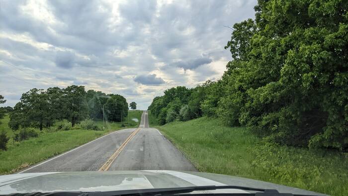 Roller-coaster hills of northeastern Missouri. (Excuse the dirty windshield!)