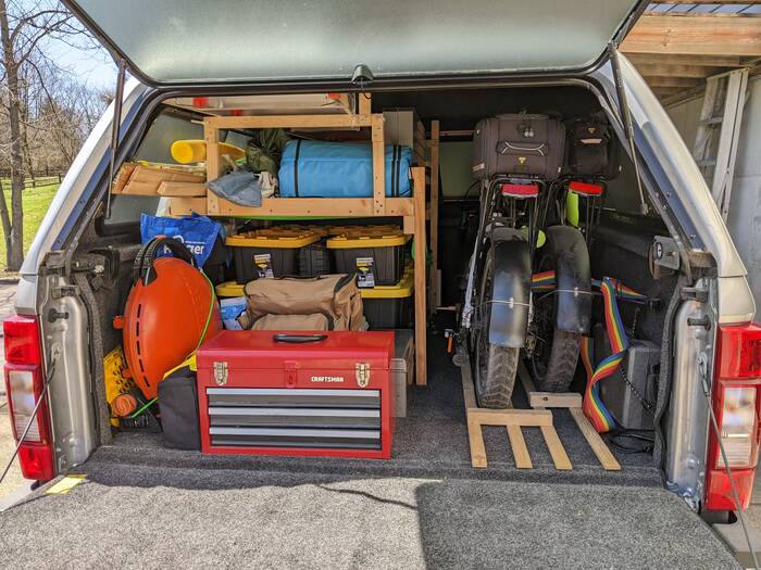 The rear of the truck is used as our "garage" and stores our folding bikes and what remains of all of Rick's tools.