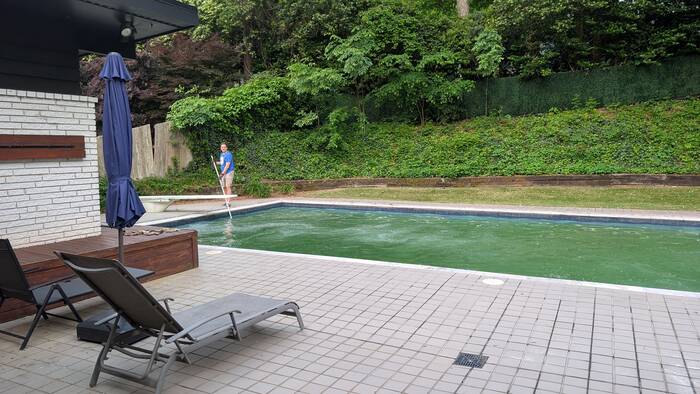 Eric engaged in the annual alchemy of changing a pool from green to blue