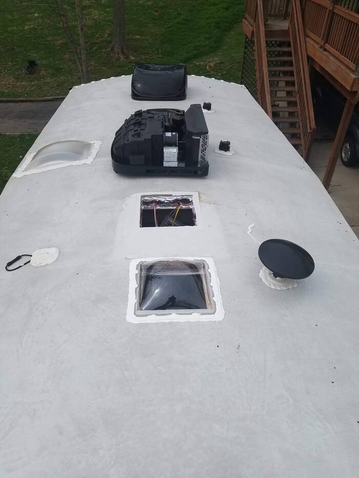 Here you can see the new skylight already installed and caulked in place. Note the clean area right above it - that is where the air conditioner lives.