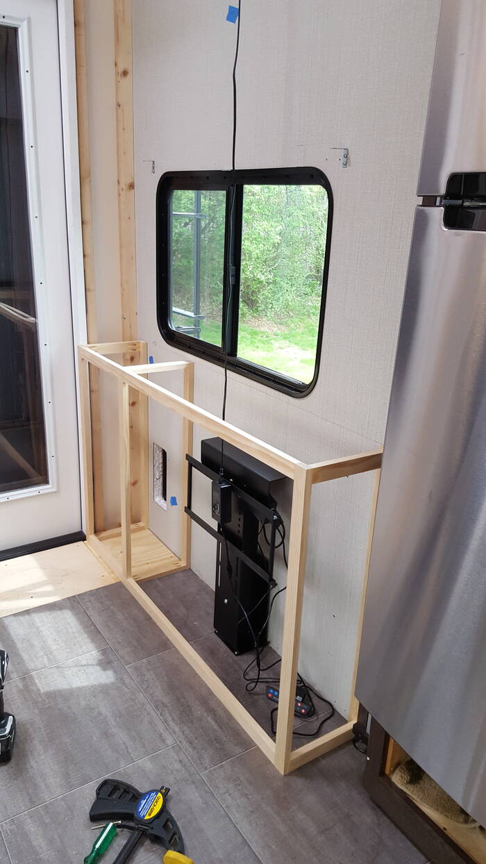 Not shown in here is the TV mounted on the lift with the speaker mounted directly above the TV (going up and down with it) and sub-woofer will be located under the TV.