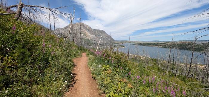 It cleared up on Friday, and we took the Bertha Lake trail right off of the campground. We opted not to go all the way to Bertha Lake for a few reasons: we were kind of tired of the burned/dead tree look; Rick's allergies have been sapping some of his energy and it would have been quite the additional climb; it didn't seem like we could top the views of Upper Waterton Lake that we had along the first half of the hike; and some hikers warned of a large bear near the trail if we kept going. So, after we made it to the official overlook point, we decided to turn back.