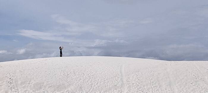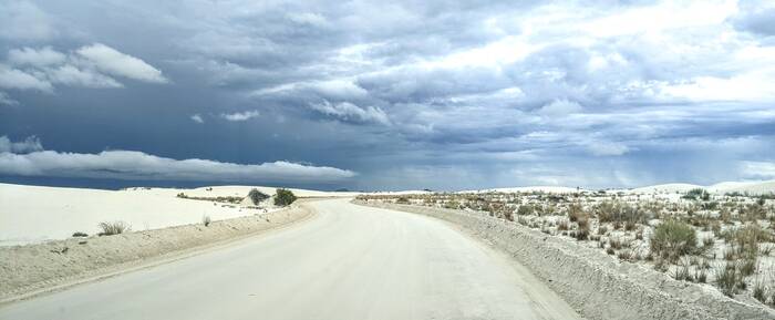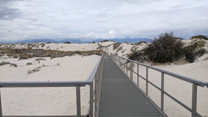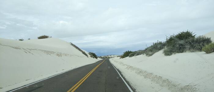Our first glimpse of the white sand dunes along the scenic drive. It had been drizzling, which made it look like it just snowed and the road was plowed.